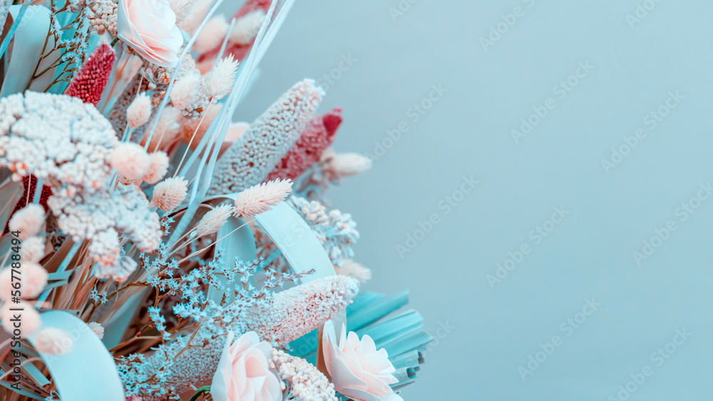 A modern bouquet of dried and preserved flowers dominated by turquoise colours.