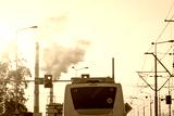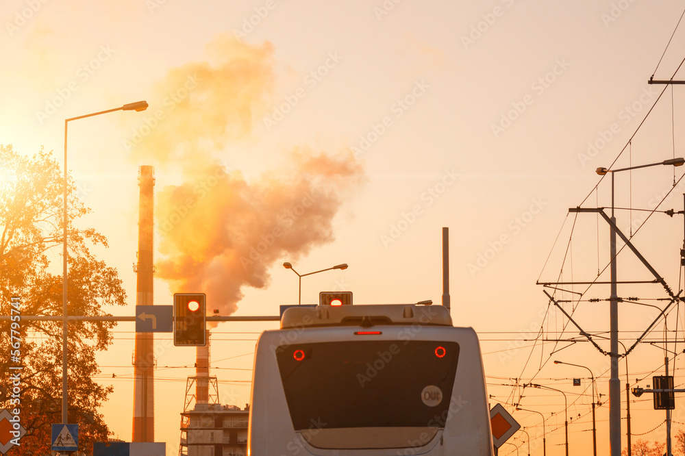 Smoking chimneys of a factory in the city against the backdrop of a pink-yellow sunset