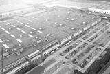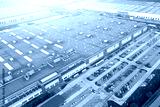 Aerial view of a large modern factory for the production of household electrical appliances, many cars are parked near the production building