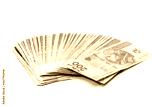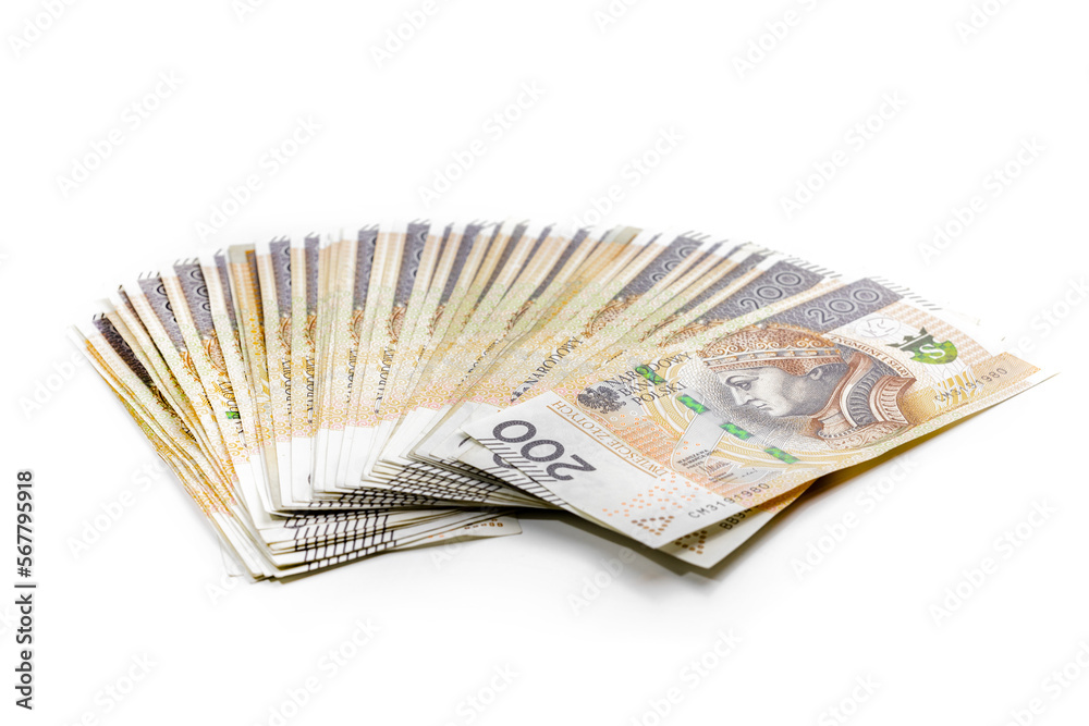 A pile of Polish banknotes stands on a white background, 200 zloty banknotes