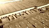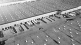 Aerial view of a large modern factory for the production of household electrical appliances, many cars are parked near the production building