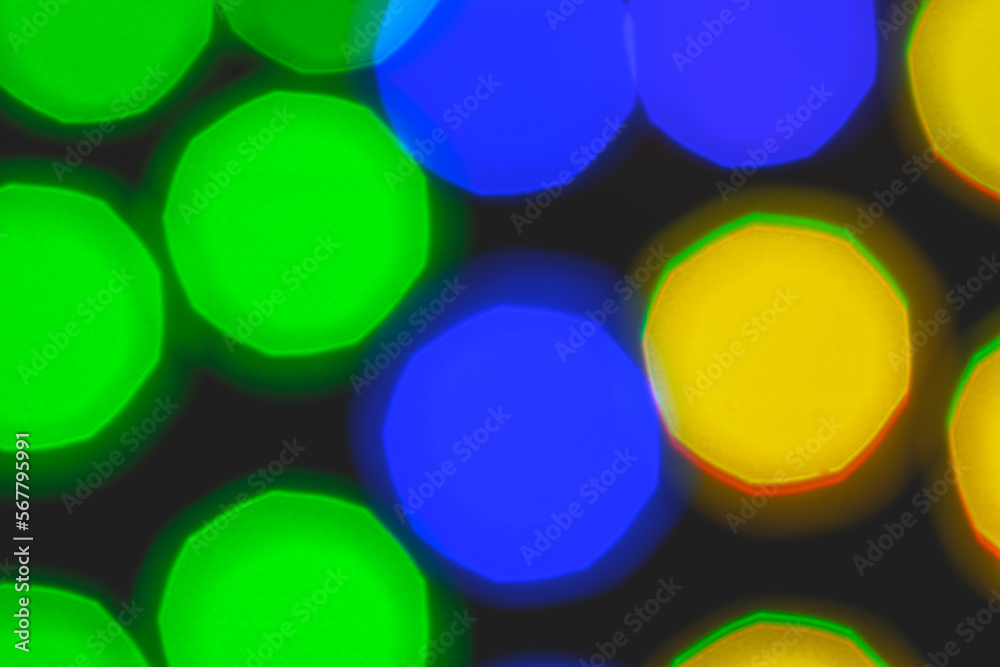 Bright multicolored lamps out of focus for background, bokeh lamps