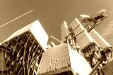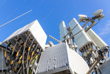 Close-up of a tower with a 5G and 4G cellular network antenna against a blue sky