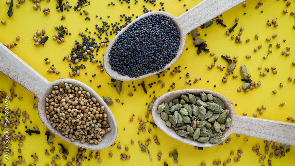 Black mustard seeds, coriander and cardamom in wooden spoon on yellow background