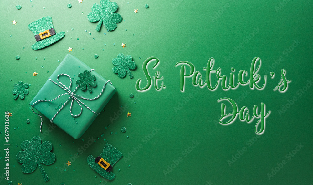 Happy St Patrick's Day decoration concept made from shamrocks ( clover leaf), gift box and leprechaun hat on green background.