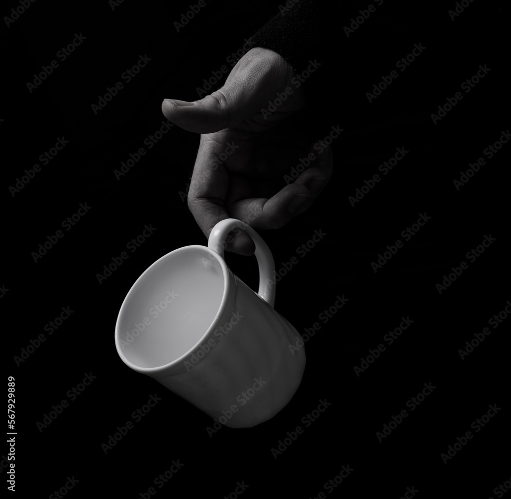 Man hand with coffee cup. Tea cup. Man hand. Black and white photo.