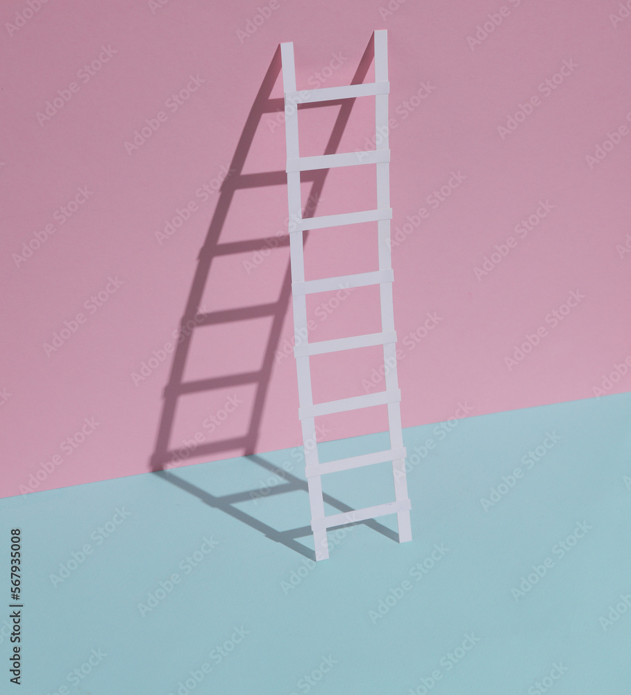 Paper ladder on a blue-pink pastel background. Creative layout, business, career growth concept
