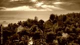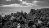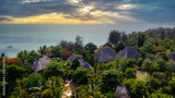 Aerial view of a beautiful beach on the tropical island of Zanzibar blue water, green palm trees. View from above