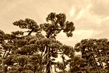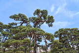 A large Japanese pine tree with stilts supporting it from falling over.