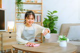 Asian woman spray bottle clean and sparkling at Home, housekeeping concept