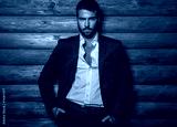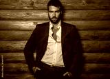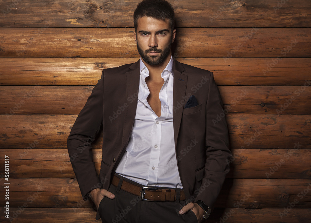 Young beautiful fashionable man against wooden wall.