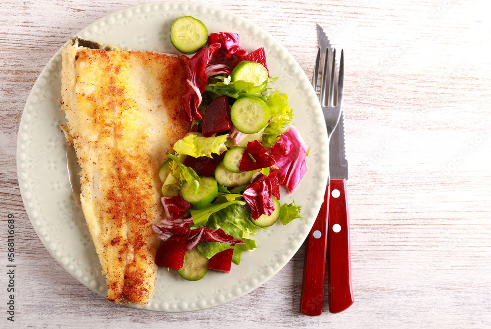 white fish fillet and salad