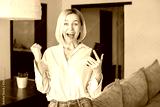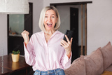 Attractive middle-aged 40s woman looking at her smart phone and smiling while standing at home