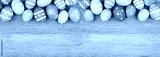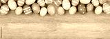 Colorful Easter egg top border. Overhead view on a light wood banner background. Copy space.