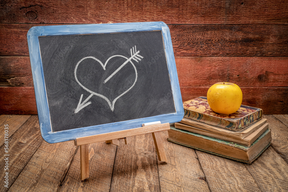 heart pierced by arrow, a modern symbol of sexual love, white chalk sketch on blackboard, Valentine's Day concept