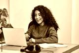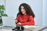 Happy young latin business woman looking at laptop reading good news on email feeling excited by new job offer, watching webinar online, satisfied by great online work results or winning on web.