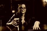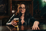sexy woman with big breasts with a glass of lager beer in hand at bar in pub