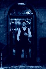 stylish man in a hat stands with a glass of beer in hand at the door to bar