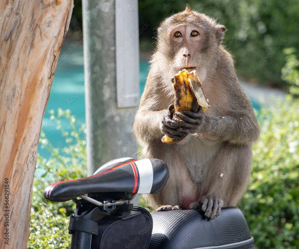A macaque monkey sits on a bicycle and eats a banana, Thailand
