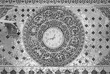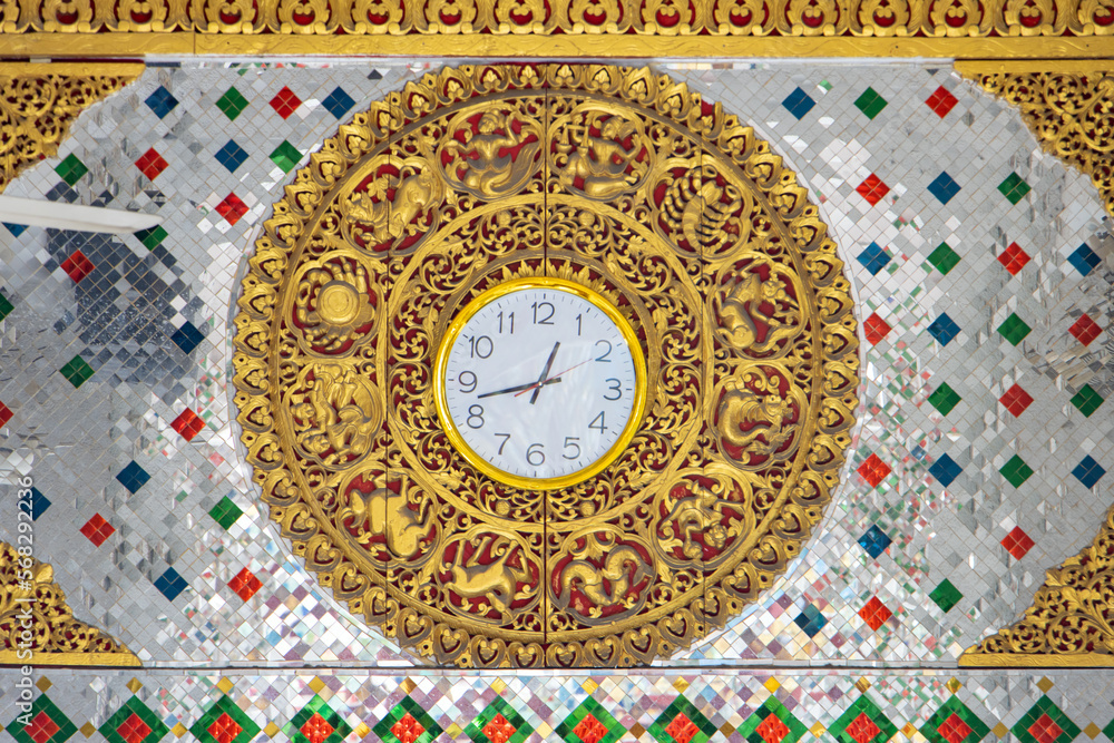 Golden clock on the decorative wall of a Buddhist temple, Thailand