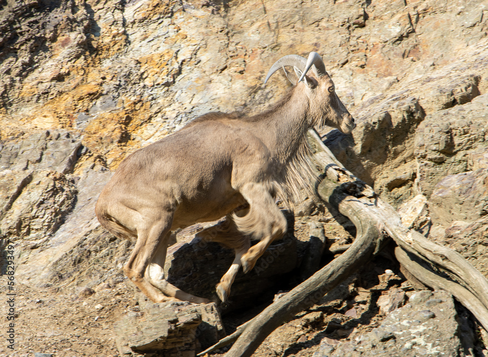 Barbary sheep (AMMOTRAGUS LERVIA) jumps on a rocky wall