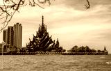 Sanctuary of Truth. Beautiful Landmark view of sculpture of Sanctuary of Truth temple with sunset sky background in Pattaya, Thailand.