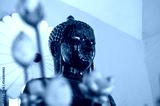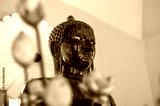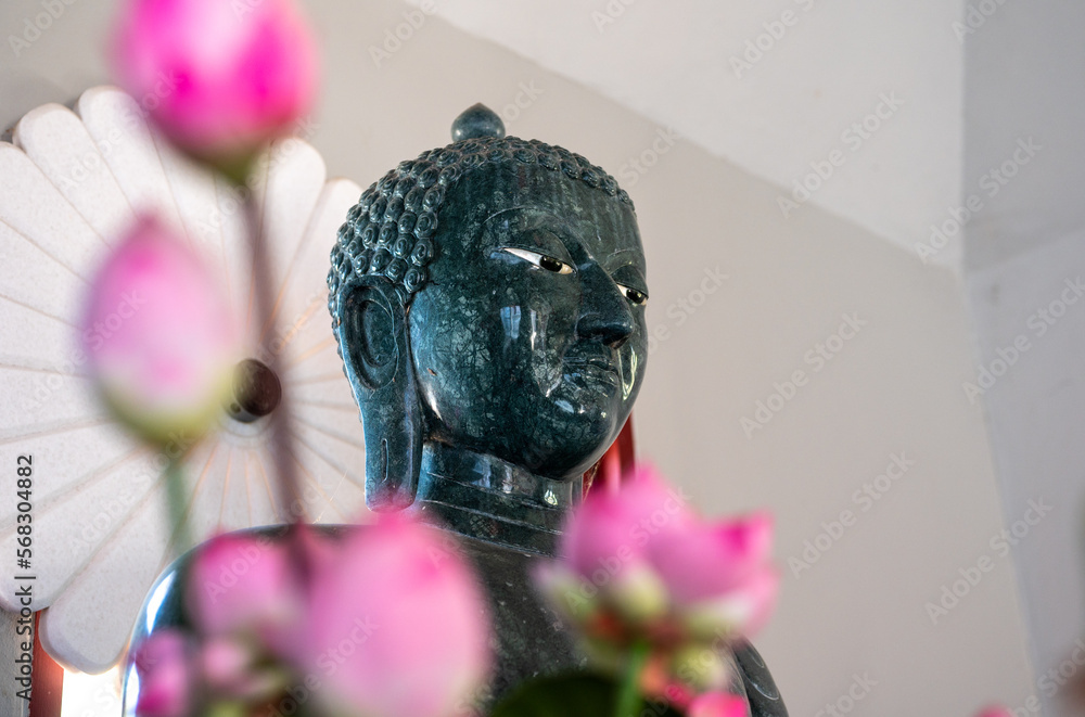 Close up of stone Buddha in temple. Buddha Statue. Buddha Sculpture at Wat Temple in Thailand. Lotus flowers in the foreground