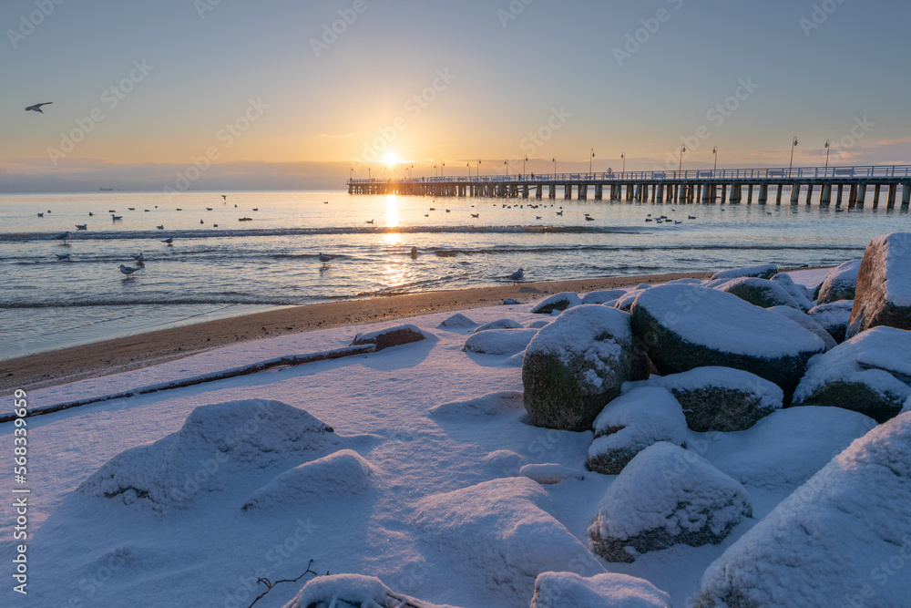 Winter on Baltic Sea in Gdynia, Poland:View at the sea and pier in Orlowo