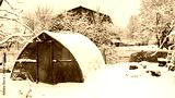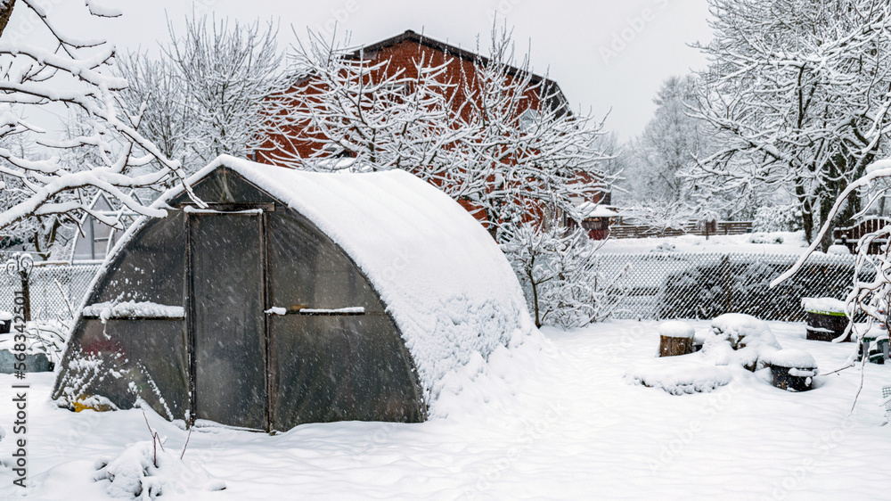greenhouse in winter, view of small garden in winter, snow covers garden objects, trees