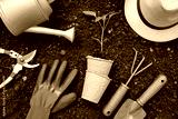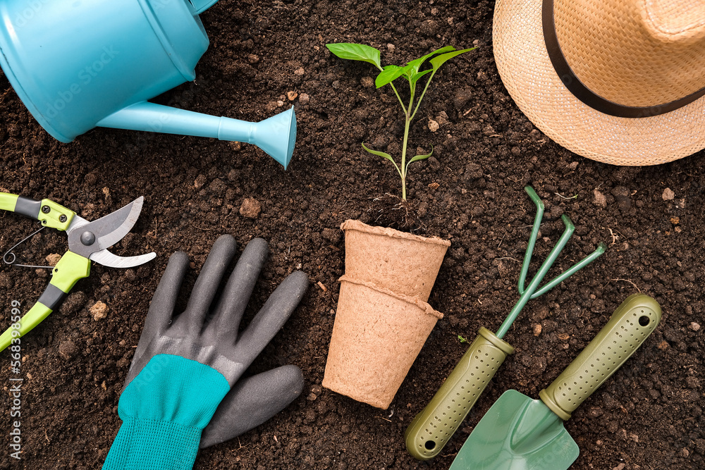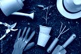 Growing seedlings of vegetables for planting greenhouse, tools gardener and gardener