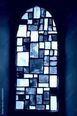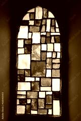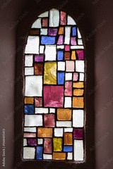 Texture of an abstract stained glass window with geometrical and coloured forms in a church