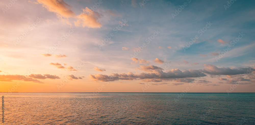 Panoramic sea skyline beach. Amazing sunrise beach landscape. Panorama of tropical beach seascape horizon. Abstract colorful sunset sky light tranquil relax summer seascape freedom wide angle seascape