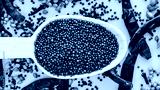 Wooden spoon with black mustard seeds on yelow background with red peppers