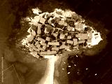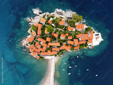 Aerophotography. Aerial view of Sveti Stefan island in a beautiful summer day, Montenegro from flying drone. Panoramic above view of Saint Stephen luxury resort. Tourism and leisure concept.