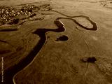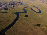 aerial view of a beautiful winding river flows among the fields, which flows picturesquely, creating incredible landscapes. between flooded fields and swamps.