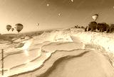 Concept Travel Pamukkale Turkey. Hot air balloon flying Travertine pool and terraces sunset