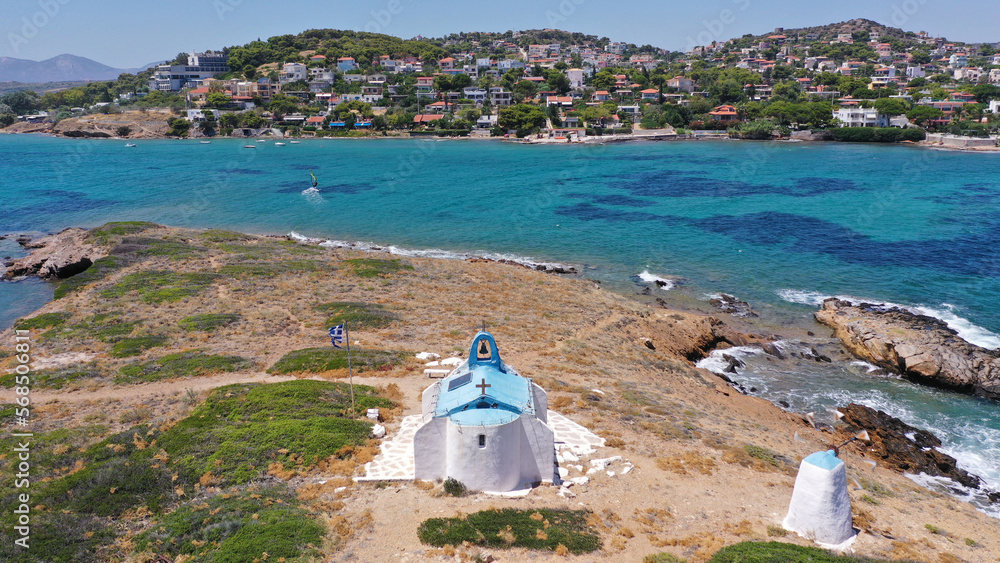 Aerial photo of picturesque small chapel of Saint Alexandros in small islet of Vravrona surounded by turquoise clear waters, Attica, Greece