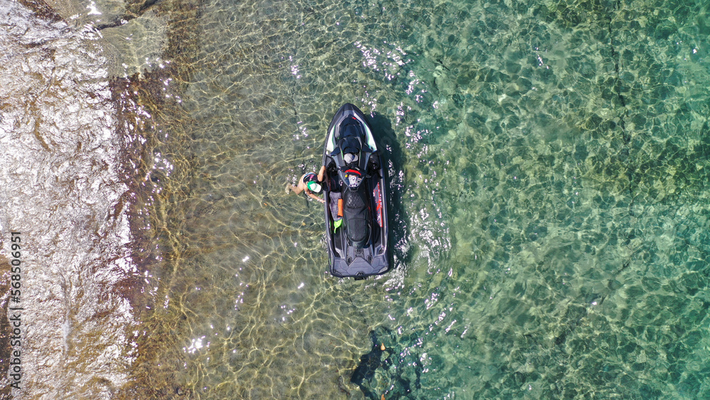Aerial drone top view of jet ski water craft cruising in low speed in mediterranean emerald clear waters