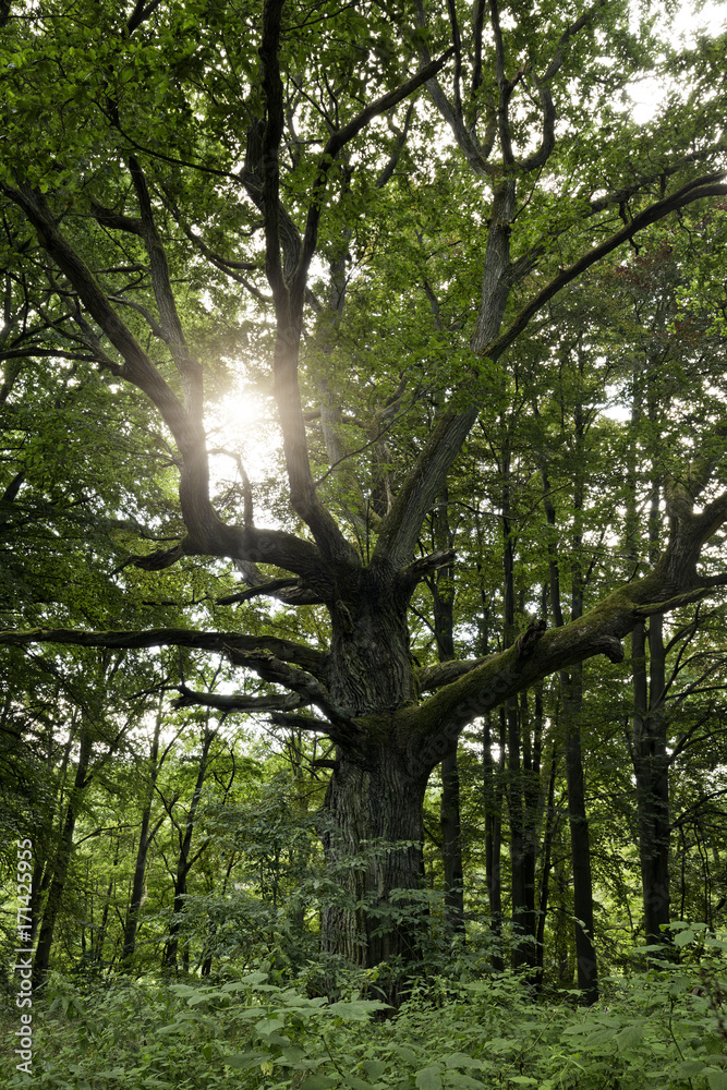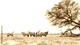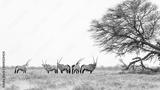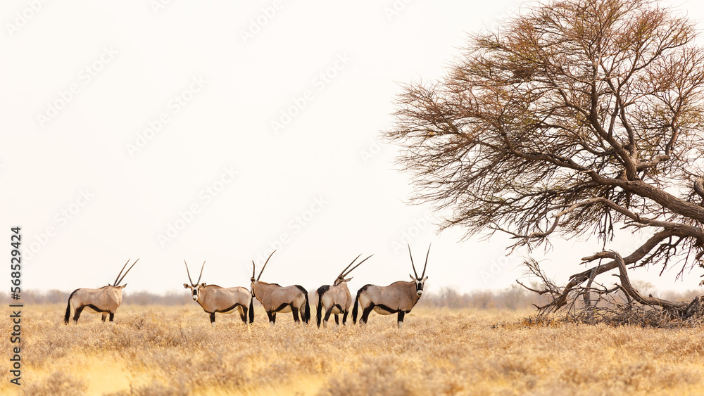 Antelope (Oryx gazella) standing near a tree in Etosha National Park, Namibia.