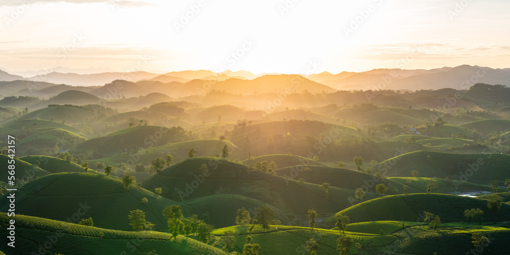 Long Coc tea plantation in sunrise, Beautiful morning hill. Asia agriculture