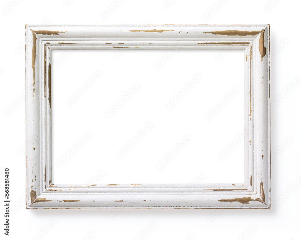 Shabby chic white and golden photo or picture frame isolated over a transparent background, interior or gallery mockup / design element / template