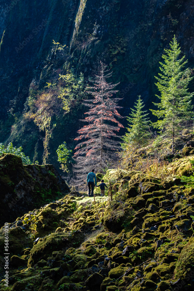 Mom and Child Hiking In Wahclella Falls Trail in the Columbia River Gorge in Oregon
