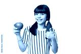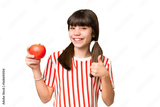 Little caucasian girl holding an apple over isolated background with thumbs up because something good has happened