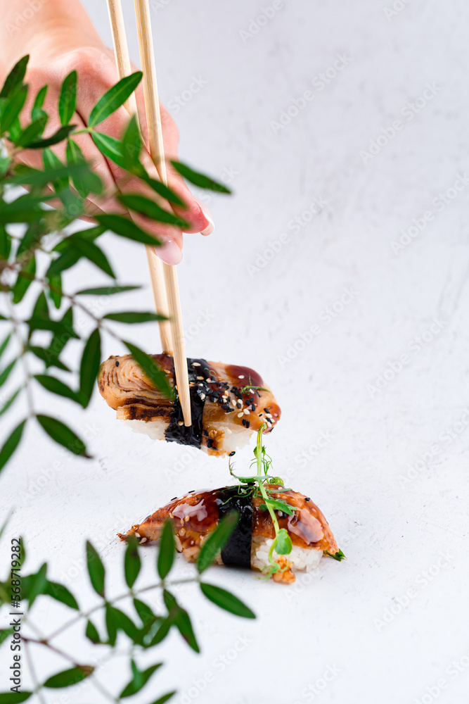Japanese cuisine nigiri sushi with smoked eel, tamago omelet, teriyaki sauce, sesame, rice, nori and chopsticks in hand.