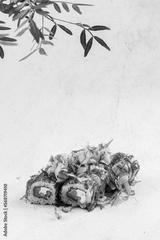 Set of sushi rolls with salmon, cream cheese, marinated chuka seaweed and dry shavings of tuna.