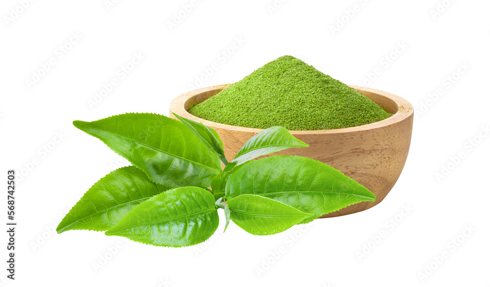 Matcha green tea in wood bowl and tea leaves on transparent png