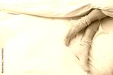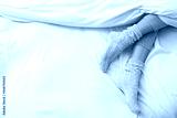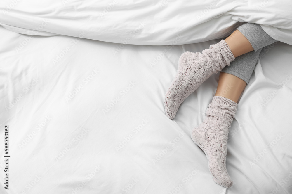 Woman wearing warm socks in comfortable bed, above view. Space for text