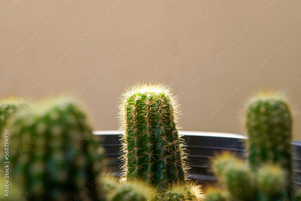 cactus, Selective focus of cactus at sunlight, brown wall background