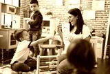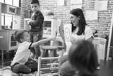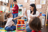 Teacher with group of boys sitting on table having emotion therapy at kindergarten