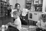 Teacher with boy and girl sitting on table having emotion therapy at kindergarten